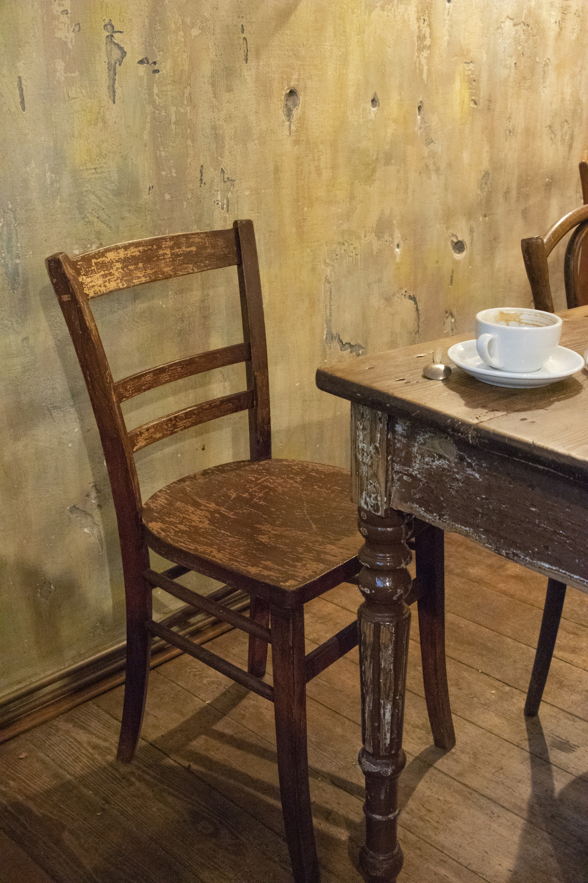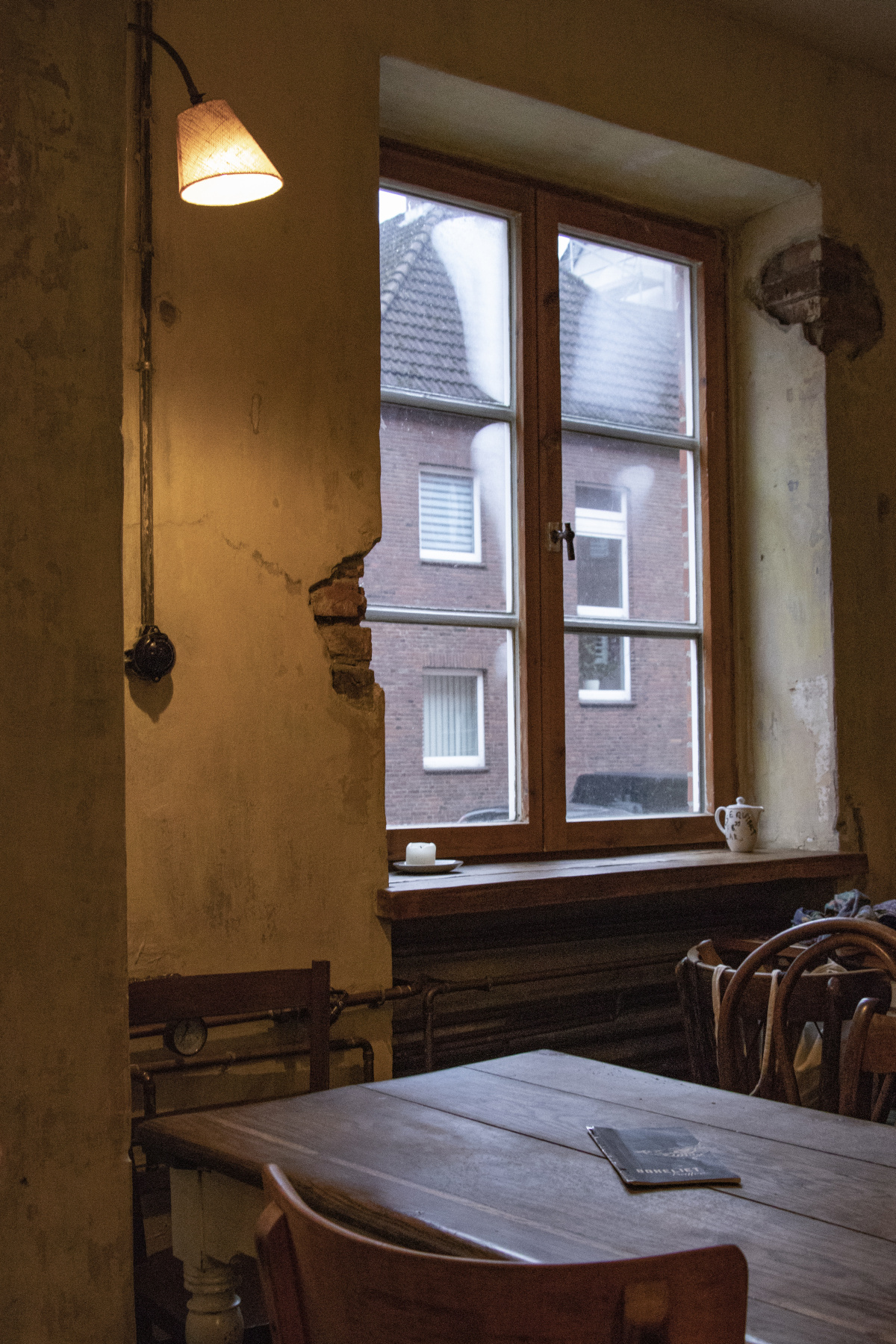 When you sit down in the café and look around, you may start examining the interior design of the café. Perhaps you will perceive walls that look damaged, worn-out tables and undisguised pipes instead of a radiator. But it ain't old or damaged. The staff explained to me how the café was refurbished and that they used moldings to create the damaged-looking walls. This isn't shabby chic. It doesn't look cute. It feels like sitting in an old storehouse in the harbour, with an an industrial charm sitting next to the coffee roasting machine. Nevertheless or maybe precisely for that reason it's comfortable and inviting.